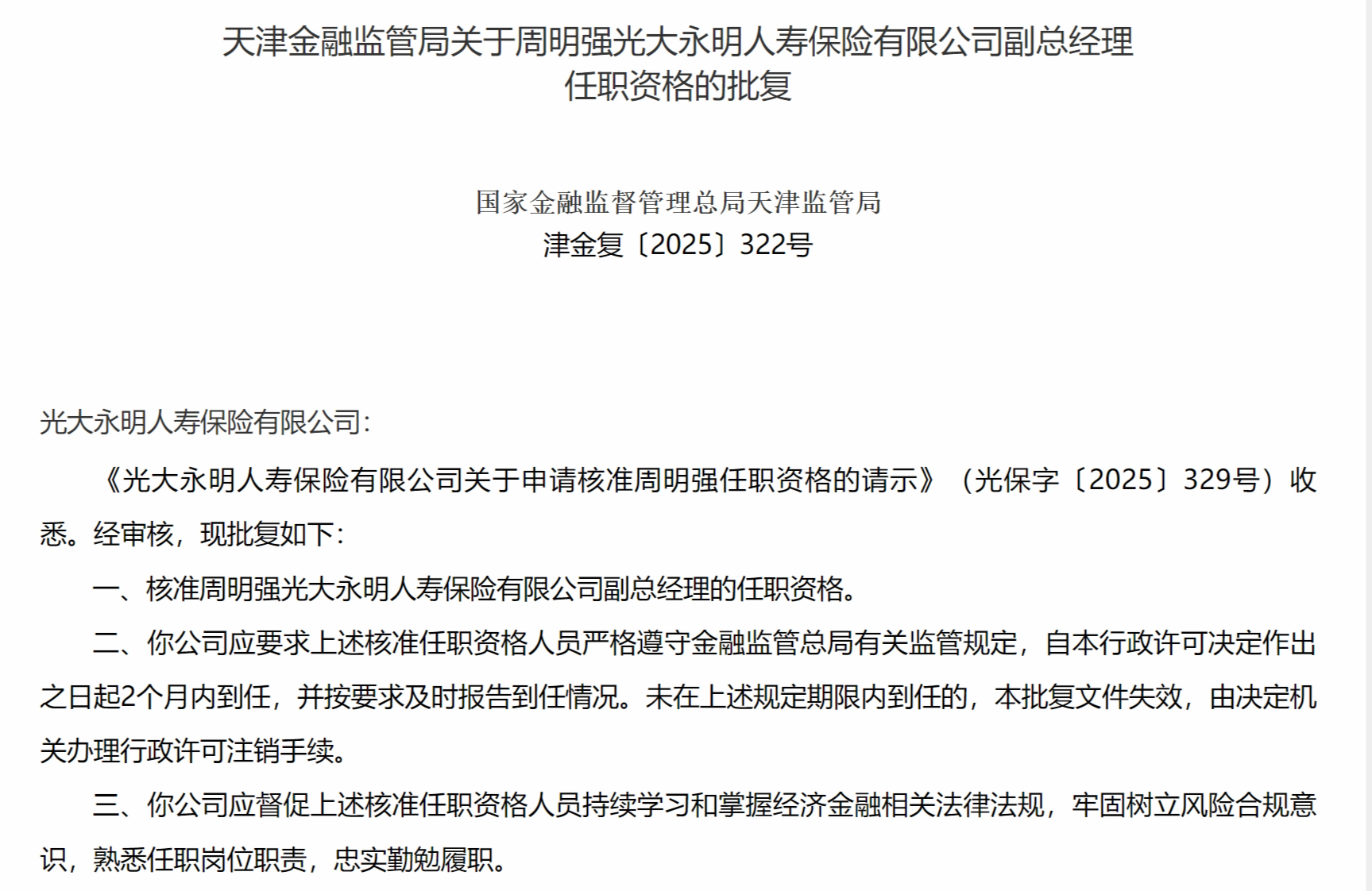 10月24日,天津金融监管局发布关于周明强光大永明人寿保险有限公司副总经理任职资格的批复信钰配资,核准周明强光大永明人寿保险有限公司副总经理的任职资格。